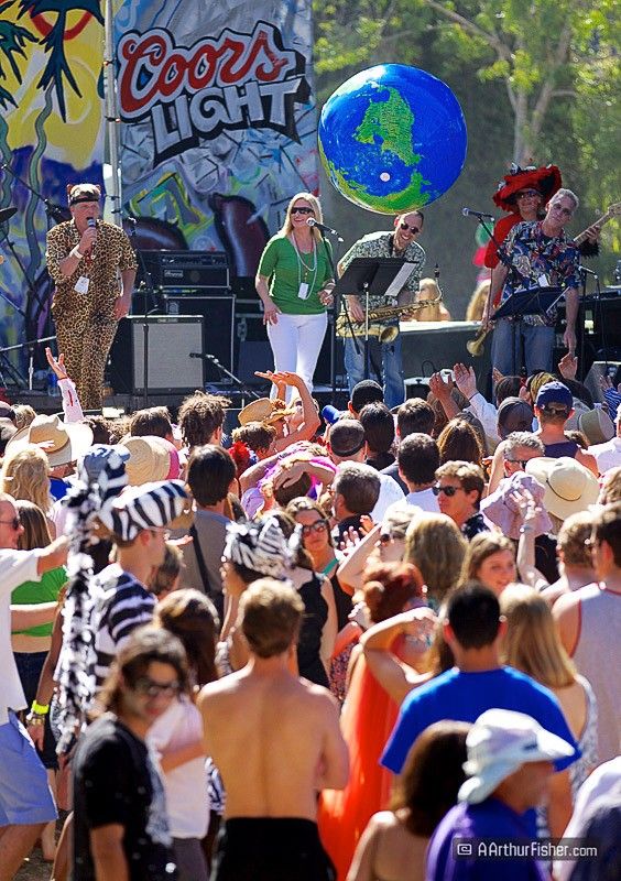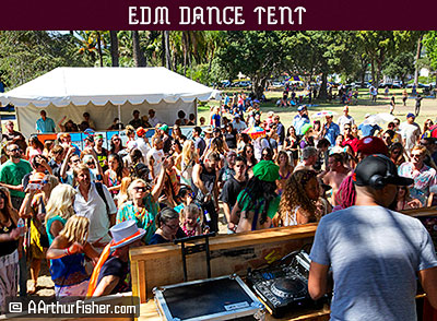 The parade ends up at Santa Barbara's Alameda Plaza park. There, all the floats can be seen on the street, surrounding the park festivities. There's a main stage, a food court, beer garden (with direct view of the stage), drum circle, and a vendor's area. Vendors sell arts, crafts, and clothing, There's also a Children's Park and EDM D.J. dance area.