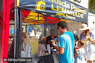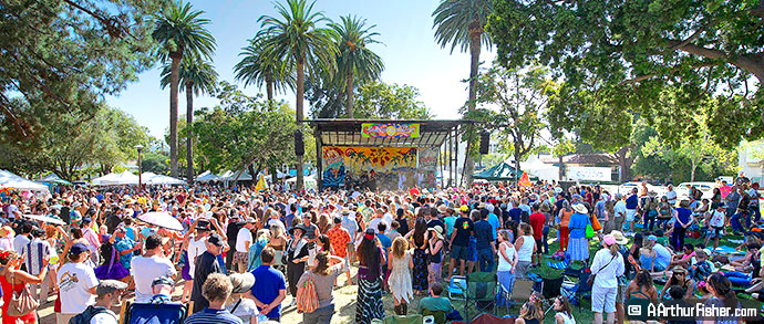 The parade ends up at Santa Barbara's Alameda Plaza park. There, all the floats can be seen on the street, surrounding the park festivities. There's a main stage, a food court, beer garden (with direct view of the stage), drum circle, and a vendor's area. Vendors sell arts, crafts, and clothing, There's also a Children's Park and EDM D.J. dance area.